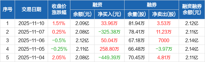 融资方面,当日融资买入1028.74万元,融资偿还994.78万元,融资净买入33.96万元。融券方面,融券卖出3.54万股,融券偿还100股,融券余量81.94万股,融券余额330.22万元。融资融券余额合计2.12亿元。