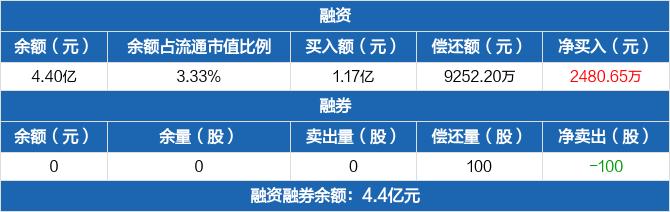 融资方面,当日融资买入1.17亿元,融资偿还9252.2万元,融资净买入2480.65万元。融券方面,融券卖出0股,融券偿还100股,融券余量0股,融券余额0元。融资融券余额合计4.4亿元。