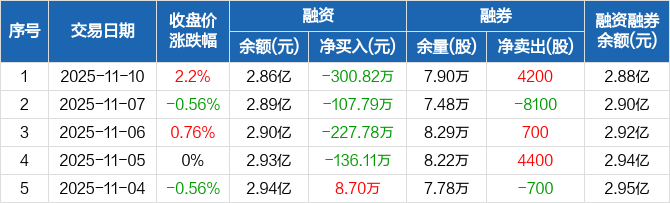 融资方面,当日融资买入774.78万元,融资偿还1075.6万元,融资净偿还300.82万元,连续4日净偿还累计772.5万元。融券方面,融券卖出4200股,融券偿还0股,融券余量7.9万股,融券余额128.38万元。融资融券余额合计2.88亿元。