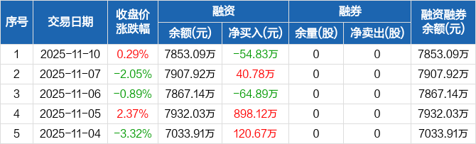 融资方面,当日融资买入463.97万元,融资偿还518.8万元,融资净偿还54.83万元。融券方面,融券卖出0股,融券偿还0股,融券余量0股,融券余额0元。融资融券余额合计7853.09万元。
