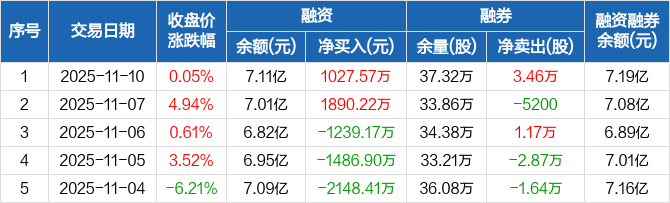融资方面,当日融资买入1.76亿元,融资偿还1.65亿元,融资净买入1027.57万元。融券方面,融券卖出3.78万股,融券偿还3200股,融券余量37.32万股,融券余额776.63万元。融资融券余额合计7.19亿元。