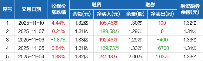 融资方面,当日融资买入801.68万元,融资偿还696.23万元,融资净买入105.45万元。融券方面,融券卖出100股,融券偿还0股,融券余量1.3万股,融券余额12.84万元。融资融券余额合计1.32亿元。