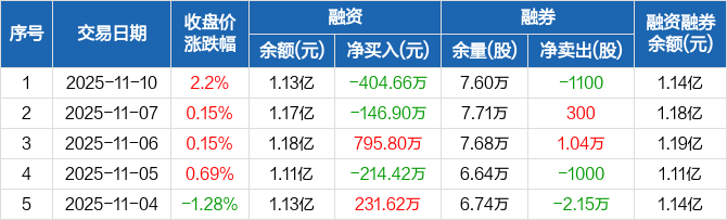 融资方面,当日融资买入719.03万元,融资偿还1123.69万元,融资净偿还404.66万元。融券方面,融券卖出200股,融券偿还1300股,融券余量7.6万股,融券余额102.6万元。融资融券余额合计1.14亿元。