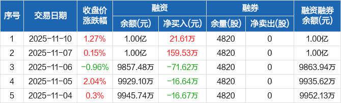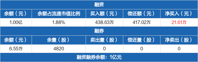 融资方面,当日融资买入438.63万元,融资偿还417.02万元,融资净买入21.61万元。融券方面,融券卖出0股,融券偿还0股,融券余量4820股,融券余额6.55万元。融资融券余额合计1亿元。