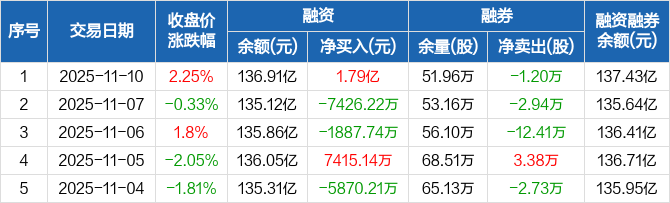 融资方面,当日融资买入6.26亿元,融资偿还4.47亿元,融资净买入1.79亿元,净买入额两市排名第17。融券方面,融券卖出2.73万股,融券偿还3.93万股,融券余量51.96万股,融券余额5164.3万元。融资融券余额合计137.43亿元。