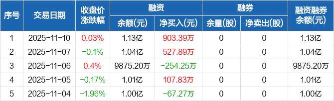 融资方面,当日融资买入1237.16万元,融资偿还333.76万元,融资净买入903.39万元。融券方面,融券卖出0股,融券偿还0股,融券余量0股,融券余额0元。融资融券余额合计1.13亿元。