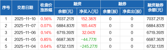 融资方面,当日融资买入427.84万元,融资偿还275.46万元,融资净买入152.38万元,连续3日净买入累计349.86万元。融券方面,融券卖出0股,融券偿还0股,融券余量0股,融券余额0元。融资融券余额合计7037.21万元。