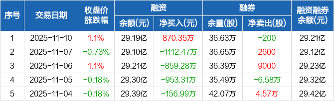 融资方面,当日融资买入7774.02万元,融资偿还6903.68万元,融资净买入870.35万元。融券方面,融券卖出2.84万股,融券偿还2.86万股,融券余量36.63万股,融券余额202.56万元。融资融券余额合计29.21亿元。