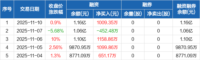 融资方面,当日融资买入3546.83万元,融资偿还2537.48万元,融资净买入1009.35万元。融券方面,融券卖出0股,融券偿还0股,融券余量0股,融券余额0元。融资融券余额合计1.16亿元。