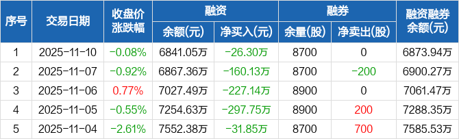 融资方面,当日融资买入351.41万元,融资偿还377.71万元,融资净偿还26.3万元,连续5日净偿还累计743.18万元。融券方面,融券卖出0股,融券偿还0股,融券余量8700股,融券余额32.89万元。融资融券余额合计6873.94万元。