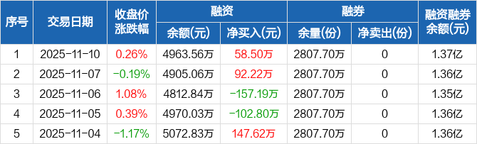 融资方面,当日融资买入316.71万元,融资偿还258.21万元,融资净买入58.5万元。融券方面,融券卖出0份,融券偿还0份,融券余量2807.7万份,融券余额8698.25万元。融资融券余额合计1.37亿元。