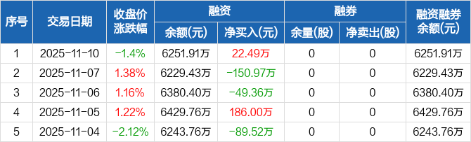 融资方面,当日融资买入264.74万元,融资偿还242.25万元,融资净买入22.49万元。融券方面,融券卖出0股,融券偿还0股,融券余量0股,融券余额0元。融资融券余额合计6251.91万元。