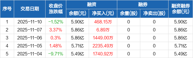 融资方面,当日融资买入6313.47万元,融资偿还5845.33万元,融资净买入468.15万元,连续11日净买入累计1.26亿元。融券方面,融券卖出0股,融券偿还0股,融券余量0股,融券余额0元。融资融券余额合计5.9亿元。