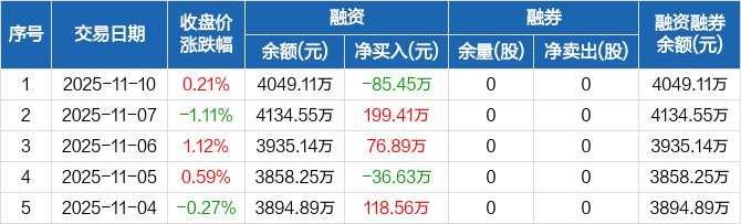 中荣股份:融资净偿还85.45万元,融资余额4049.11万元(11-10)