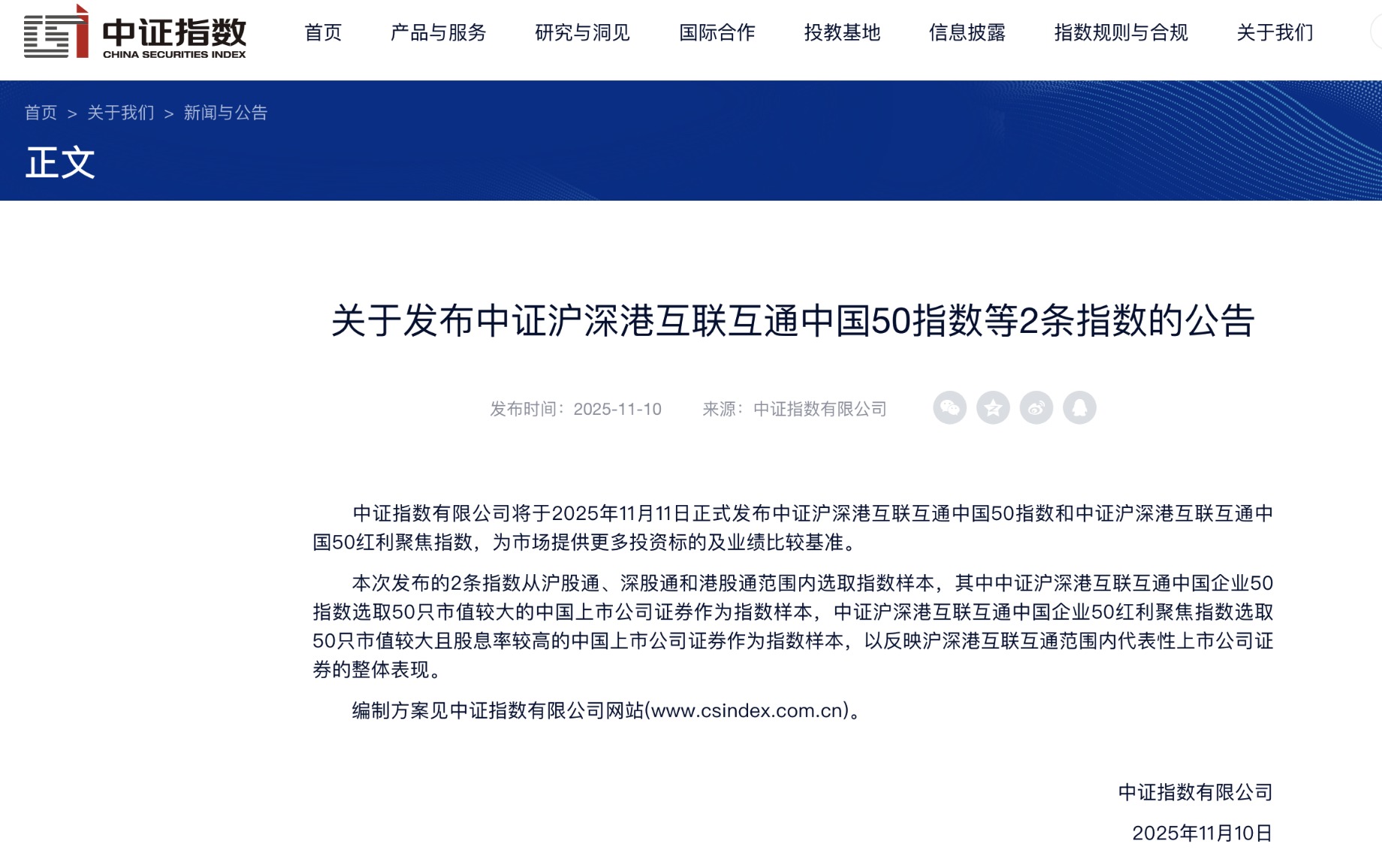 本报讯 (记者毛艺融)11月10日,中证指数有限公司在官网公告称,将于2025年11月11日正式发布中证沪深港互联互通中国50指数和中证沪深港互联互通中国50红利聚焦指数,为市场提供更多投资标的及业绩比较基准。