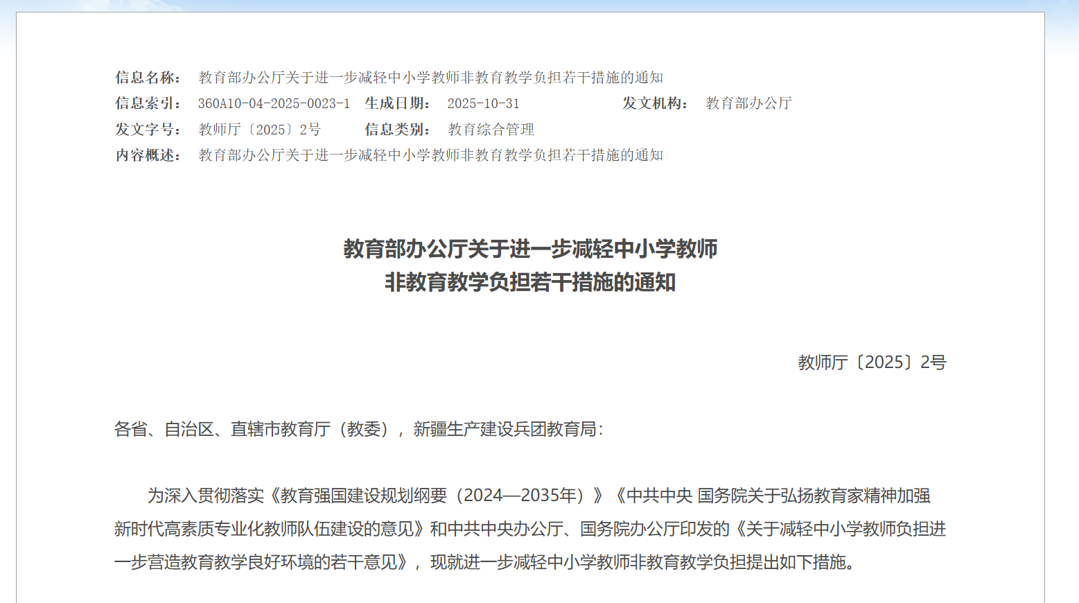 近日,教育部印发《关于进一步减轻中小学教师非教育教学负担若干措施的通知》(以下简称《通知》),对深化中小学教师减负工作作出系统部署。