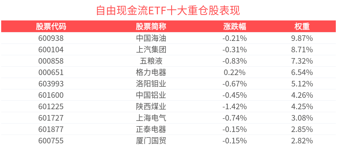 自由现金流ETF紧密跟踪国证自由现金流指数,数据显示,截至2025年10月31日,国证自由现金流指数前十大权重股分别为中国海油、上汽集团、五粮液、格力电器、洛阳钼业、中国铝业、陕西煤业、上海电气、厦门国贸和正泰电器,前十大权重股合计占比54.79%。