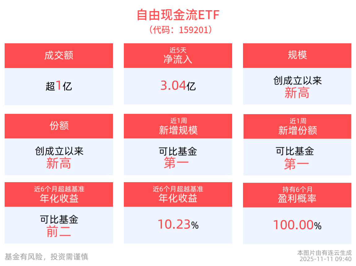流动性方面,自由现金流ETF盘中换手2.04%,成交1.2亿元。拉长时间看,截至11月10日,自由现金流ETF近1周日均成交4.08亿元,排名可比基金第一。