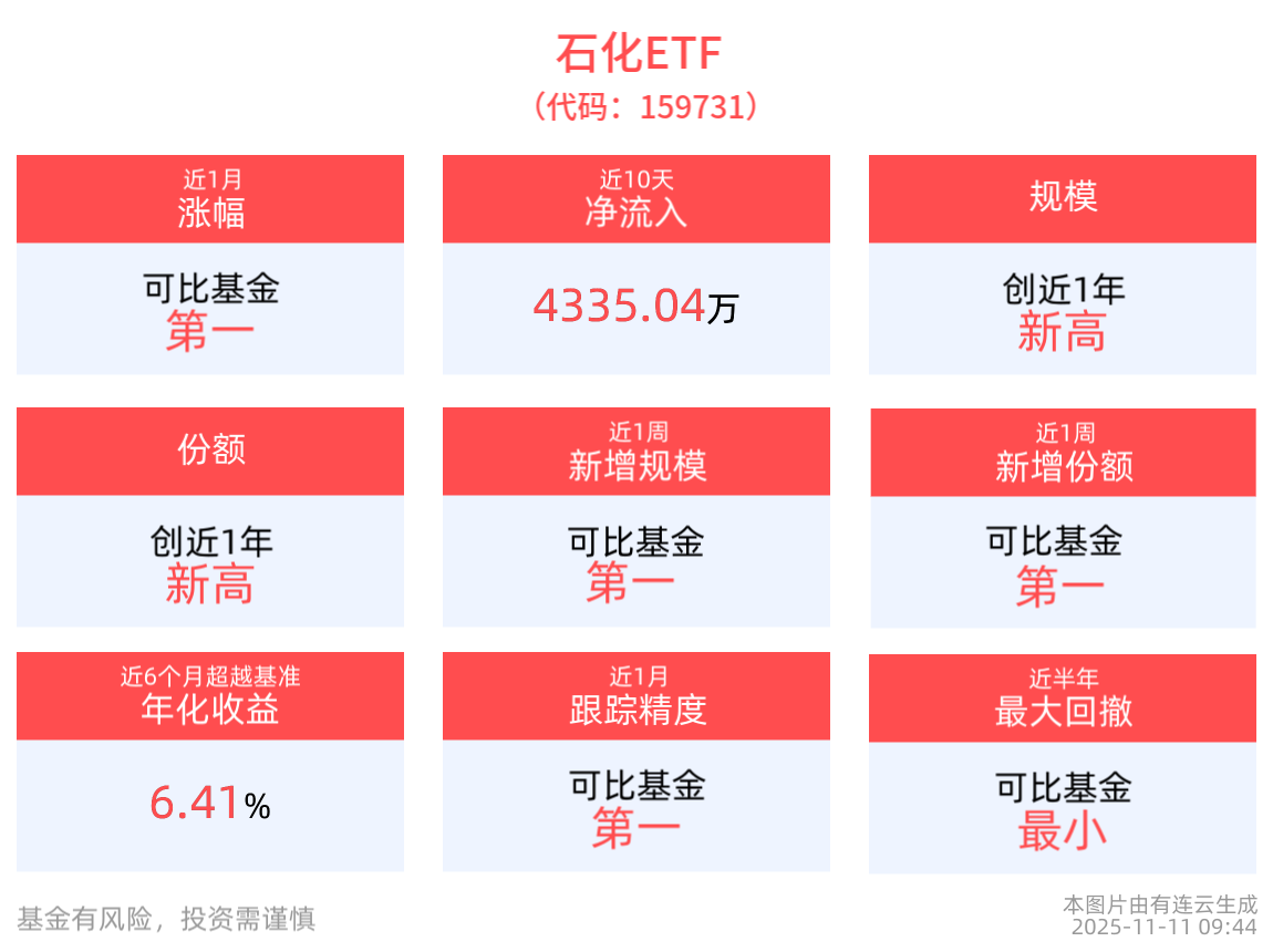 截至11月10日,石化ETF近6月净值上涨29.09%。从收益能力看,截至2025年11月10日,石化ETF自成立以来,最高单月回报为15.86%,最长连涨月数为6个月,最长连涨涨幅为23.51%,上涨月份平均收益率为5.06%。截至2025年11月10日,石化ETF近6个月超越基准年化收益为6.41%。