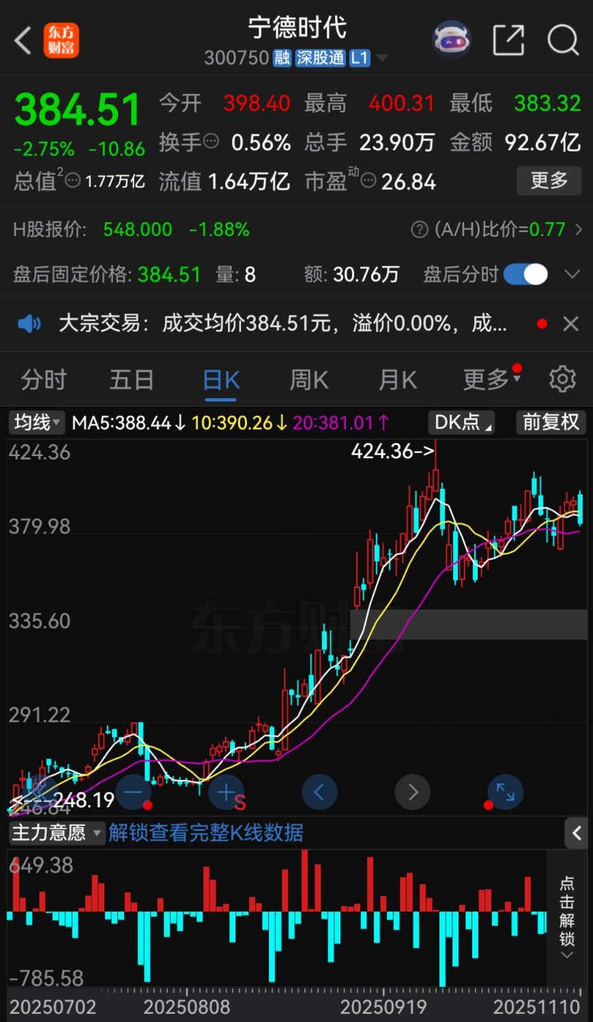 截至11月10日收盘,宁德时代A股股价报384.51元/股,跌幅达2.75%,总市值为1.77万亿元。