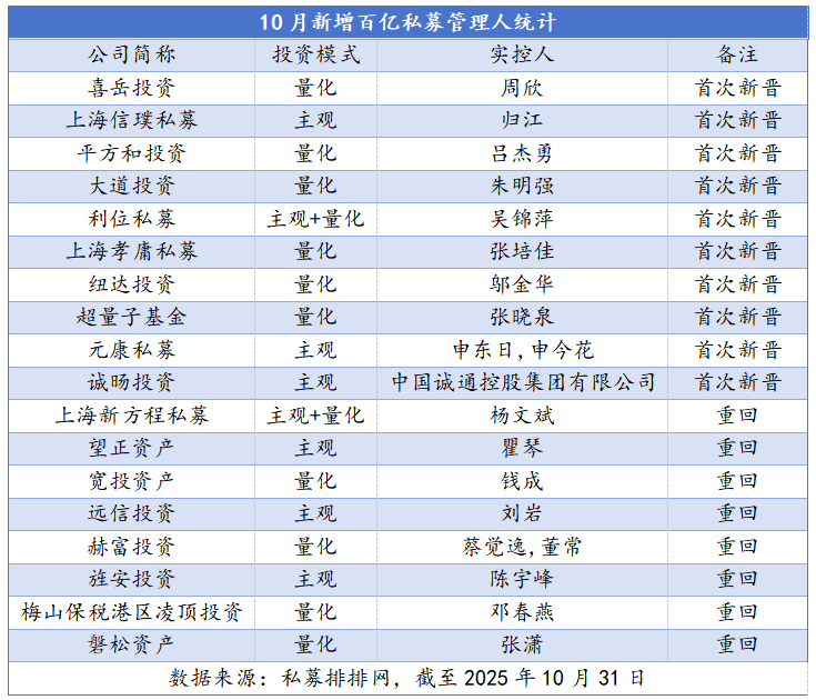 数据显示,在10月新晋的18家百亿私募中,喜岳投资、上海信璞私募、平方和投资、大道投资、利位私募、上海孝庸私募、纽达投资、超量子基金、元康私募和诚旸投资等10家私募,都是首次踏入百亿阵营的“新面孔”;望正资产、宽投资产、远信投资、赫富投资、旌安投资、梅山保税港区凌顶投资、磐松资产和上海新方程等8家私募,则是再次回归百亿阵营的“熟面孔”。