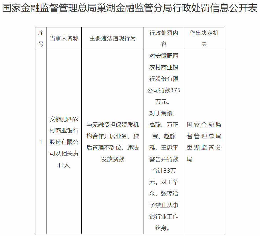 与违法发放贷款等原因,安徽肥西农商行被罚375万元,两名责任人被禁业终身!