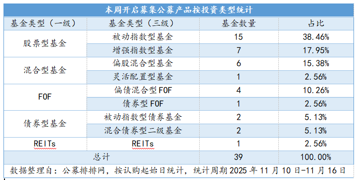 本周28只权益基金启动募集,包括22只股票型基金和6只偏股型混合基金,占总量的71.79%。从细分品类来看,股票型基金发行表现尤为强劲。本周共有22只股票型新基启动募集,占全市场发行总量的56.41%,成为发行主力。其中,被动指数型基金发行15只,占比38.46%,凭借紧贴市场、费率低的优势,成为资金抢筹指数行情的首选;增强指数型基金发行7只,占比17.95%,通过主动管理力求超额收益,精准满足了部分投资者的差异化需求。