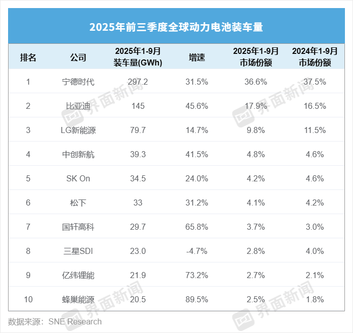 据界面新闻记者观察,前三季度动力电池装车量前十的企业中,除三星SDI外,所有企业的增速均达到两位数,且所有外企的装车量增速均超过上半年。