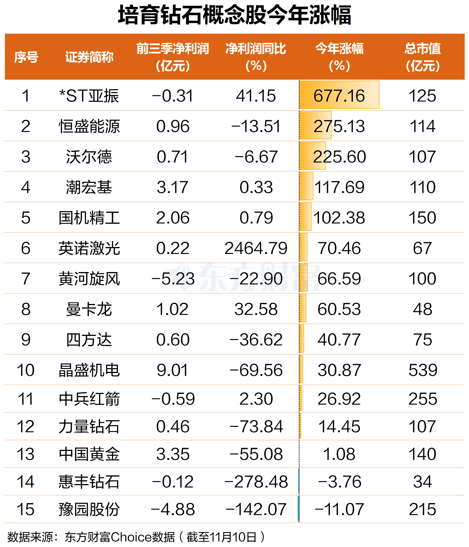 目前A股培育钻石概念股共计15只,今年以来股价表现亮眼。东方财富Choice数据显示,截至11月10日,年内培育钻石概念股中已有5股涨幅超100%,其中*ST亚振涨幅最大,达677.16%;恒盛能源、沃尔德分别上涨275.13%、225.60%;潮宏基、国机精工分别上涨117.69%、102.38%。