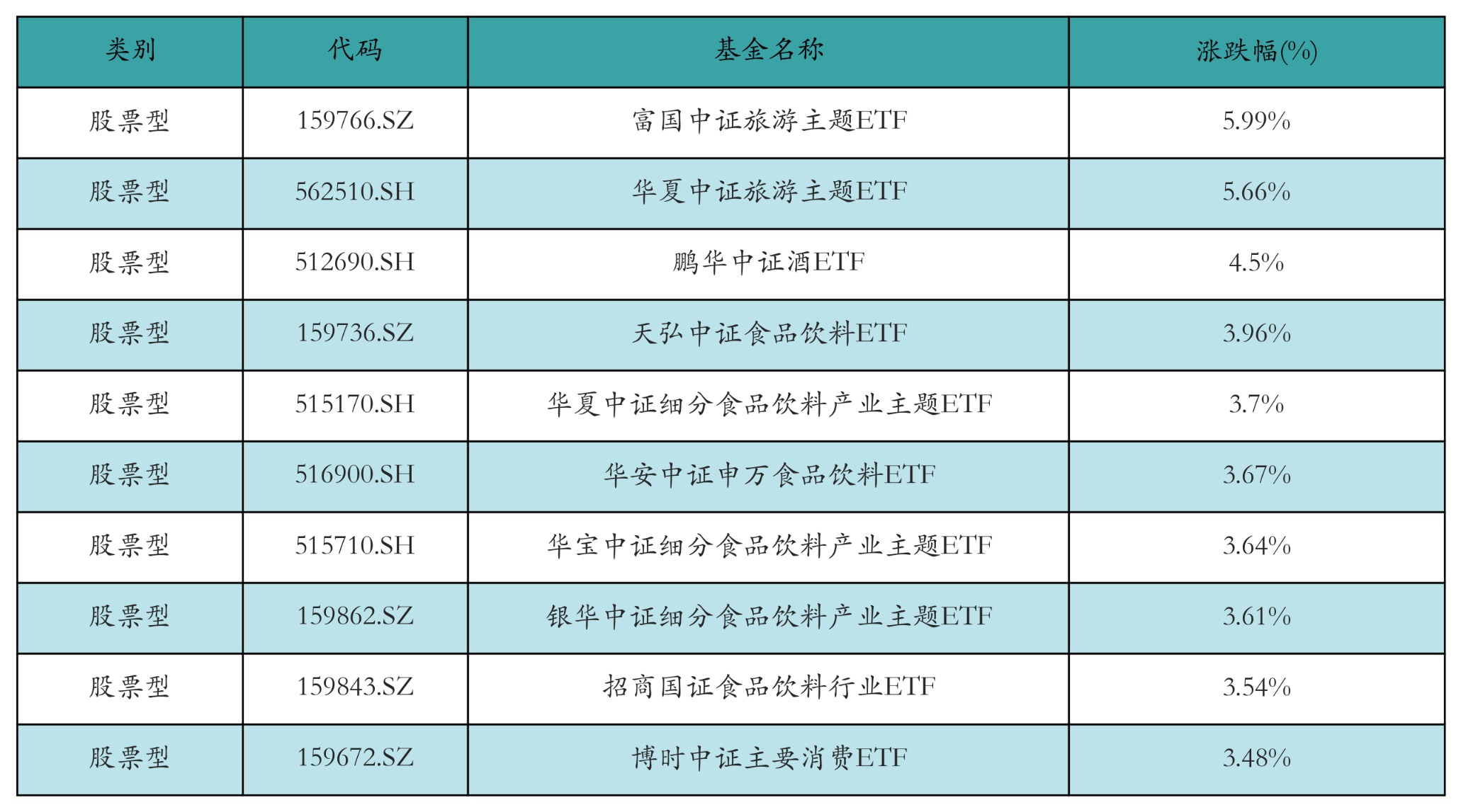昨日股票型ETF涨幅最高的3只ETF及其收益率分别为:富国中证旅游主题ETF(5.99%)、华夏中证旅游主题ETF(5.66%)、鹏华中证酒ETF(4.5%)。涨幅前10详情见下表: