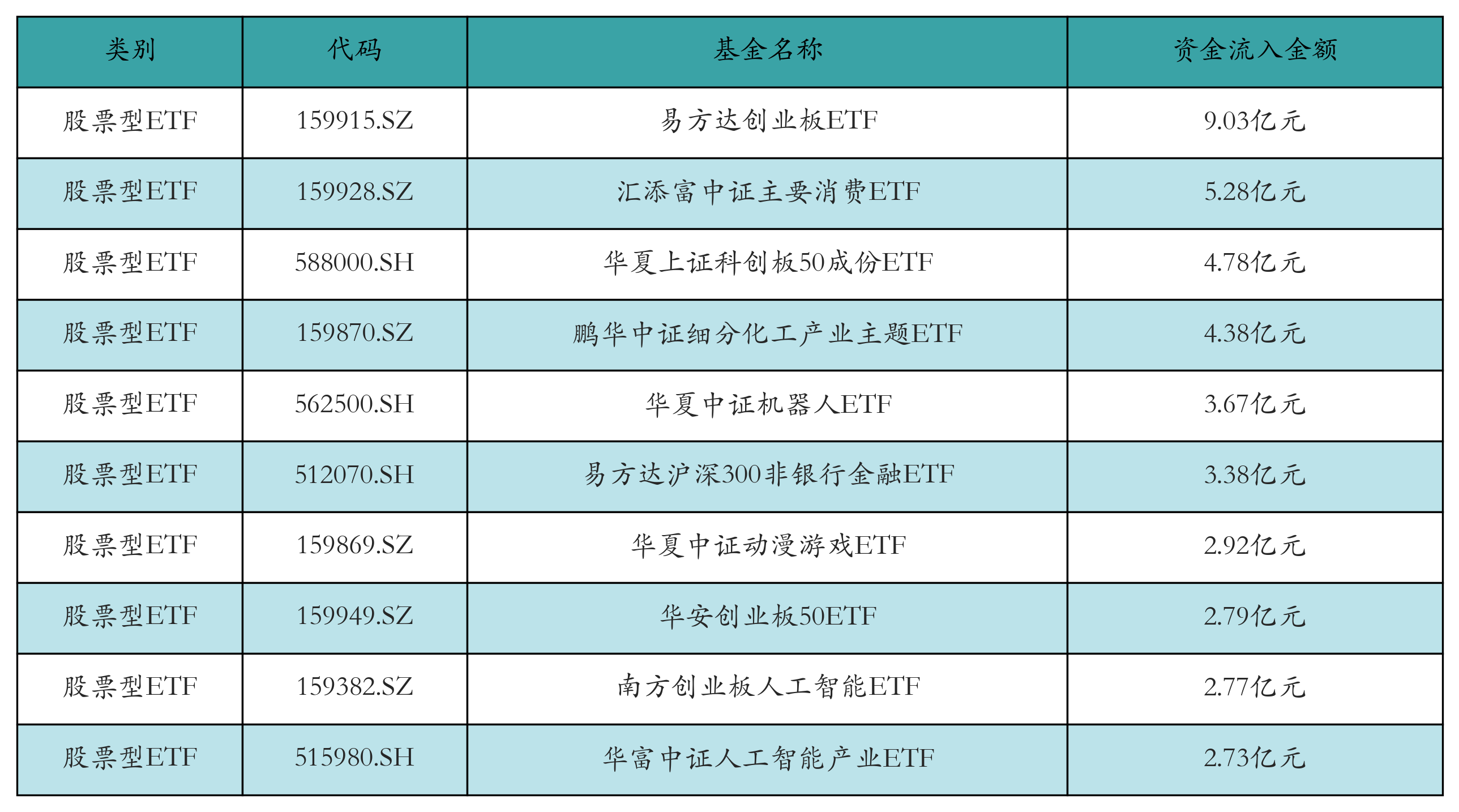 昨日股票型ETF资金流入最多的3只ETF及其流入金额分别为:易方达创业板ETF(流入9.03亿元)、汇添富中证主要消费ETF(流入5.28亿元)、华夏上证科创板50成份ETF(流入4.78亿元)。资金流入前10详情见下表: