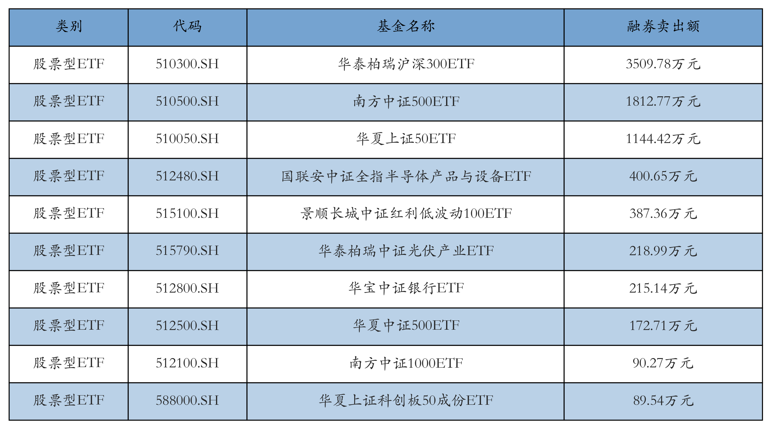 昨日股票型ETF融资卖出额最高的3只ETF及其卖出金额分别为:华泰柏瑞沪深300ETF(3509.78万元)、南方中证500ETF(1812.77万元)、华夏上证50ETF(1144.42万元)。融券卖出额前10详情见下表: