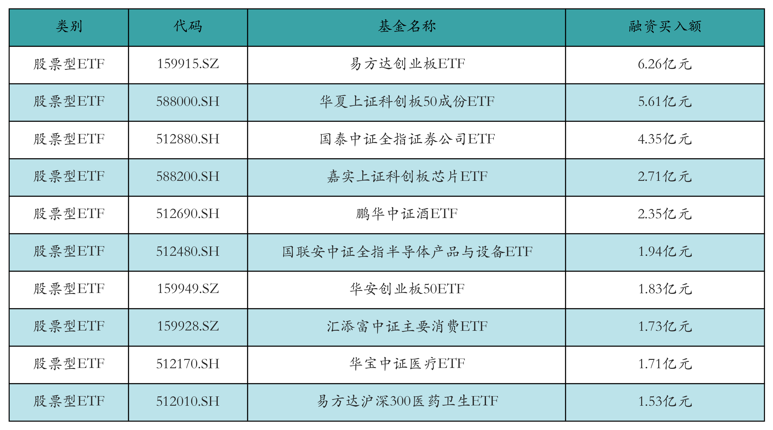 昨日股票型ETF融资买入额最高的3只ETF及其买入金额分别为:易方达创业板ETF(6.26亿元)、华夏上证科创板50成份ETF(5.61亿元)、国泰中证全指证券公司ETF(4.35亿元)。融资买入额前10详情见下表: