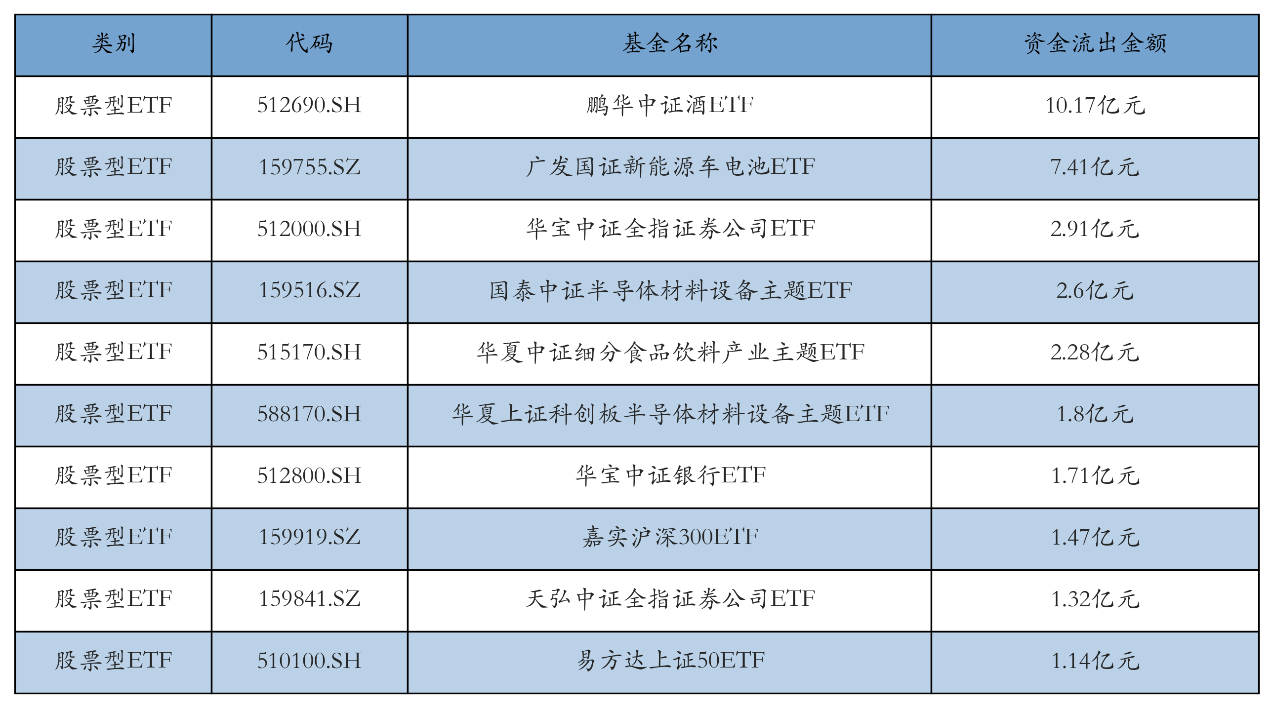 昨日股票型ETF资金流出最多的3只ETF及其流出金额分别为:鹏华中证酒ETF(流出10.17亿元)、广发国证新能源车电池ETF(流出7.41亿元)、华宝中证全指证券公司ETF(流出2.91亿元)。资金流出前10详情见下表: