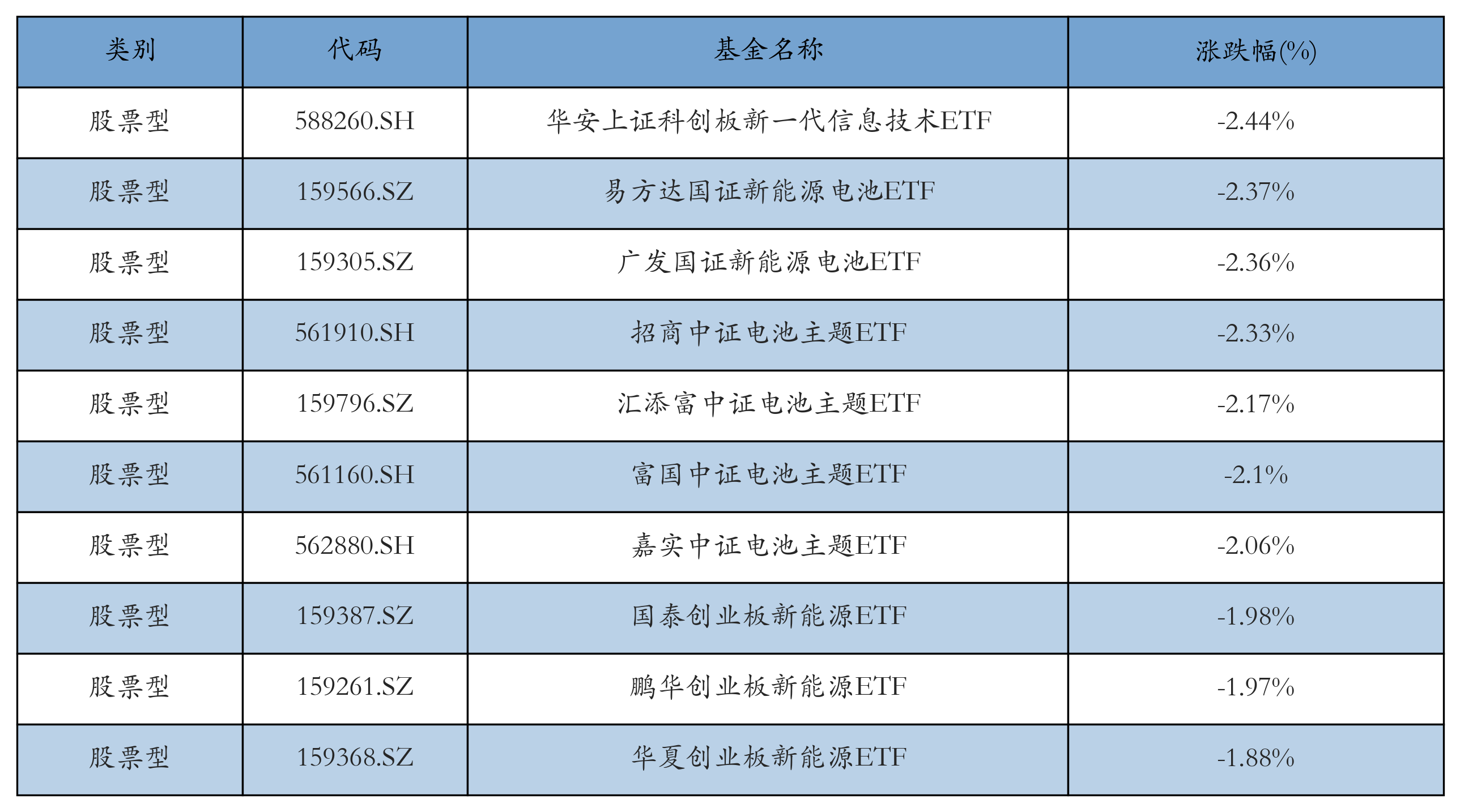 昨日股票型ETF跌幅最大的3只ETF及其收益率分别为:华安上证科创板新一代信息技术ETF(-2.44%)、易方达国证新能源电池ETF(-2.37%)、广发国证新能源电池ETF(-2.36%)。跌幅前10详情见下表: