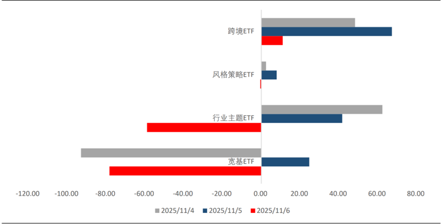 整体看,资金流出力度明显高于流入,机构积极卖出成长风格资产。行业主题ETF的资金数据,同样可以验证这个结论。11月6日,行业主题ETF单日净流出58.91亿元,其中,资金净流出前三名分别是科创芯片ETF(-13.82 亿元)、半导体ETF(-6.73亿元)、证券ETF(-5.89亿元)。资金净流入前三名分别是电网设备 ETF(+3.81 亿元)、银行 ETF(+1.75 亿元)、酒ETF(+1.75亿元)。
