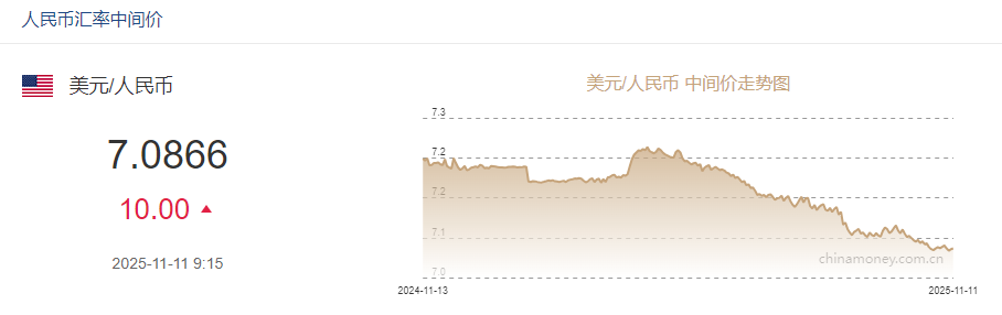 中新网11月11日电据中国外汇交易中心网站消息,中国人民银行授权中国外汇交易中心公布,2025年11月11日银行间外汇市场人民币汇率中间价为:1美元对人民币7.0866元,下调10个基点。