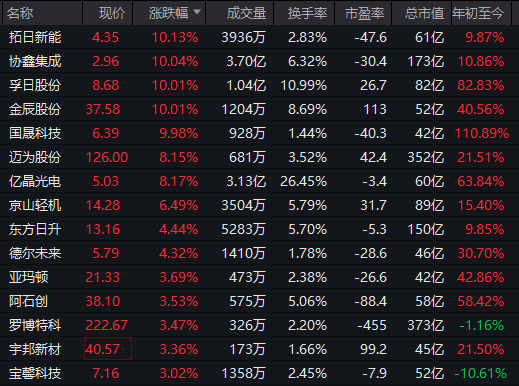 此外,HJT电池板块走高,协鑫集成、孚日股份、金辰股份等多股涨停。
