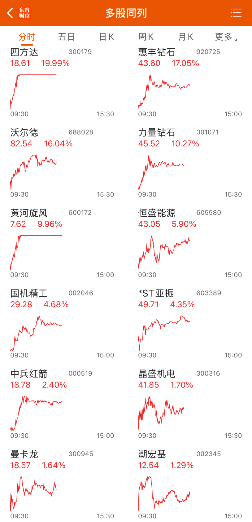 延续昨日涨势,培育钻石概念股早盘再度集体走强,四方达20cm涨停,惠丰钻石、沃尔德双双涨超15%,黄河旋风封涨停,力量钻石、恒盛能源、国机精工等跟涨。