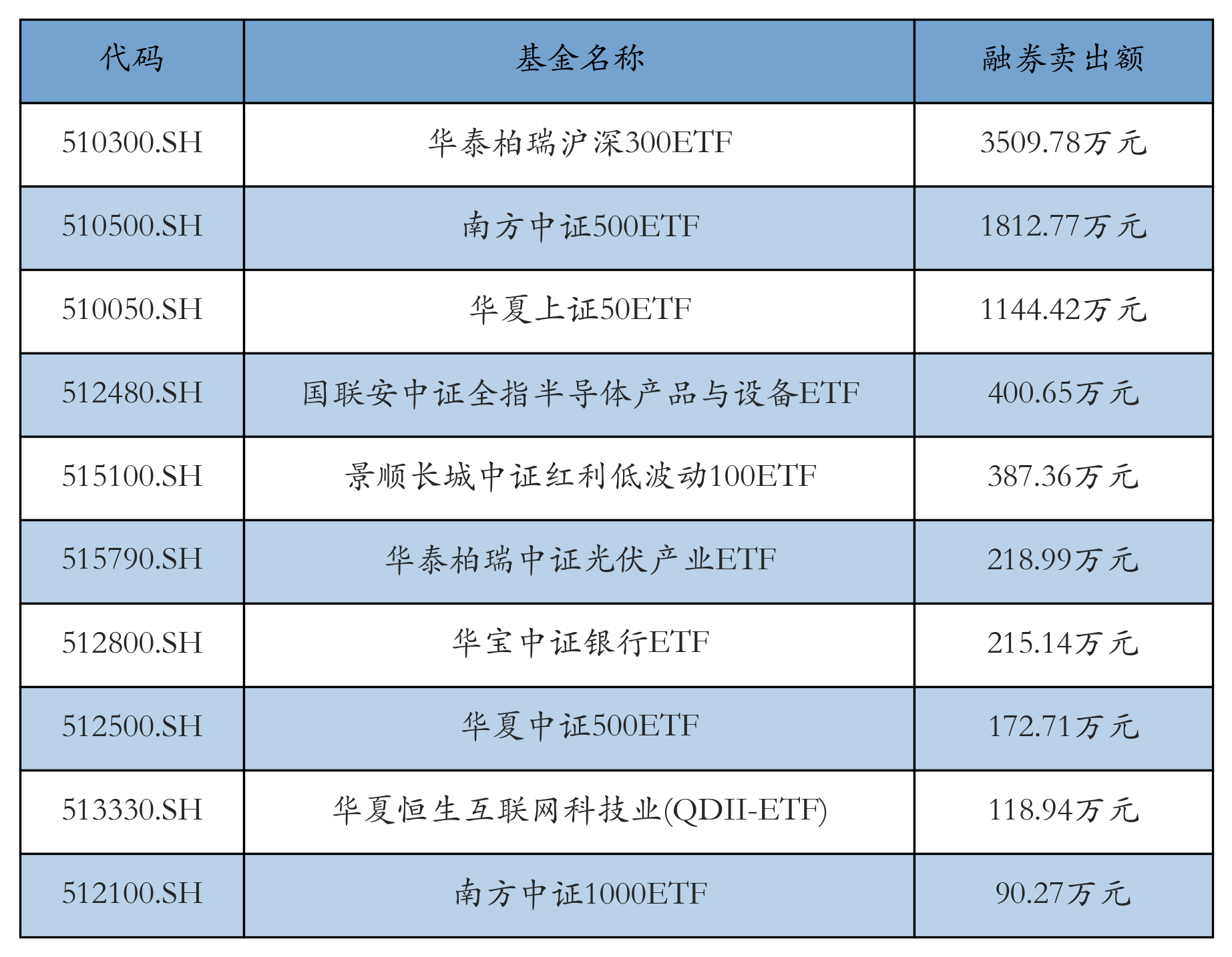 11月10日ETF融券卖出额前三位分别为:华泰柏瑞沪深300ETF(3509.78万元)、南方中证500ETF(1812.77万元)和华夏上证50ETF(1144.42万元),前10具体见下表: