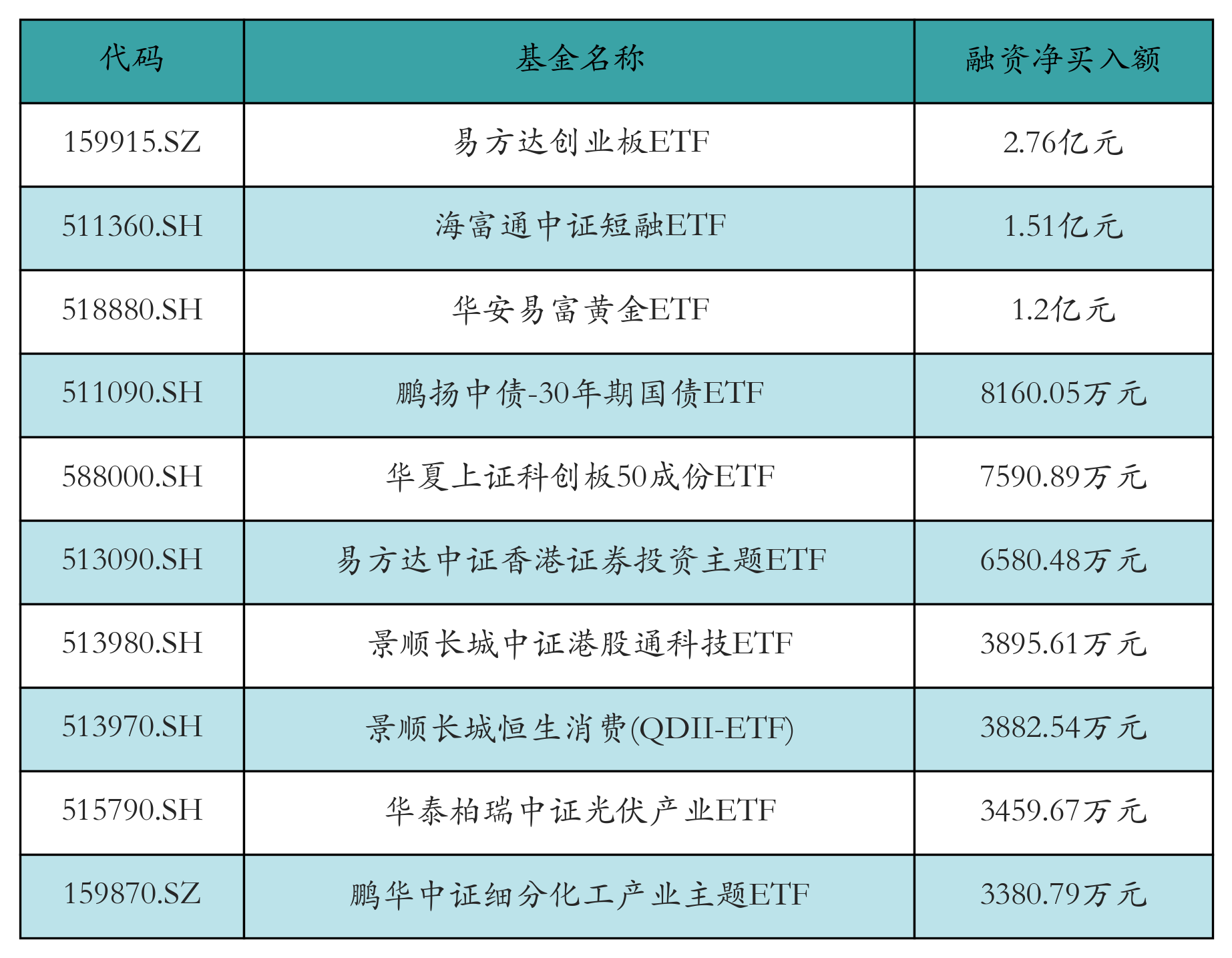 11月10日ETF融资净买入额前三位分别为:易方达创业板ETF(2.76亿元)、海富通中证短融ETF(1.51亿元)和华安易富黄金ETF(1.2亿元),前10具体见下表: