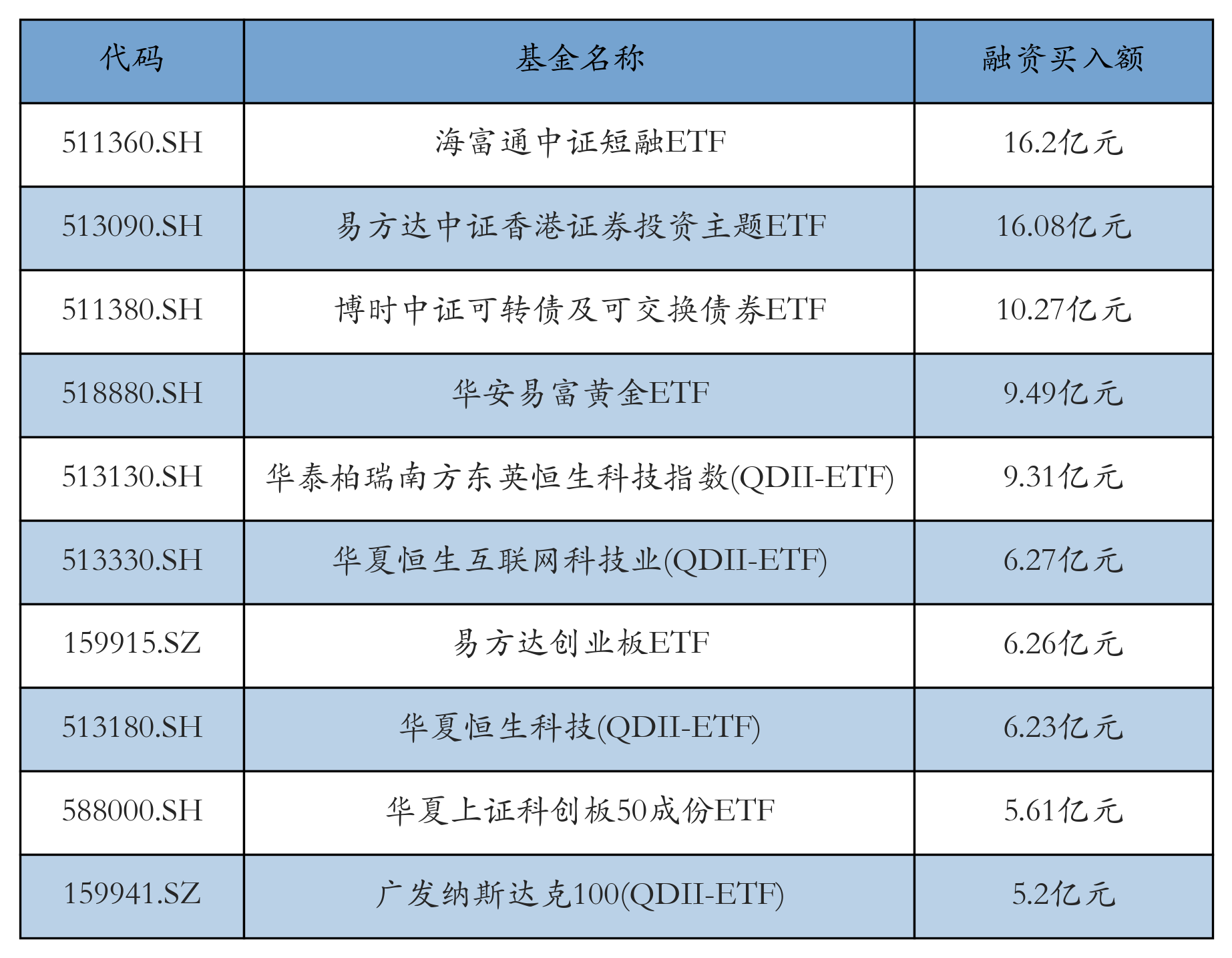 11月10日ETF融资买入额前三位分别为:海富通中证短融ETF(16.2亿元)、易方达中证香港证券投资主题ETF(16.08亿元)和博时中证可转债及可交换债券ETF(10.27亿元),前10具体见下表: