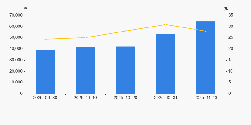 自2025年9月30日以来,公司股东户数连续4期上涨,截至目前增幅为66.63%。2025年9月30日至2025年11月10日区间股价上涨14.84%。