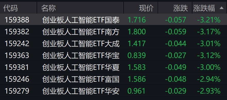 受盘面影响,创业板人工智能相关ETF跌约3%。