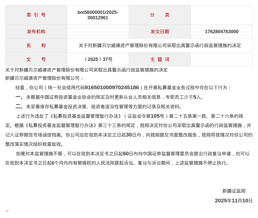 新疆贝尔威德资管被出具警示函,涉未及时更新从业人员信息等
