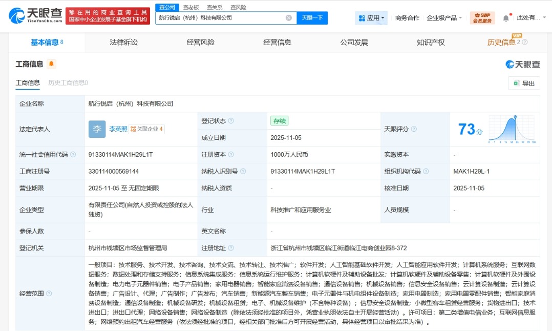 南方财经11月11日电,天眼查工商信息显示,近日,航行锐启(杭州)科技有限公司成立,法定代表人为李英照,注册资本1000万人民币,经营范围含人工智能基础软件开发、人工智能应用软件开发、计算机系统服务、互联网数据服务、数据处理和存储支持服务、信息系统集成服务、信息系统运行维护服务、计算机软硬件及辅助设备批发等。股东信息显示,该公司由萝卜快跑关联公司萝卜运力(北京)科技有限公司全资持股。