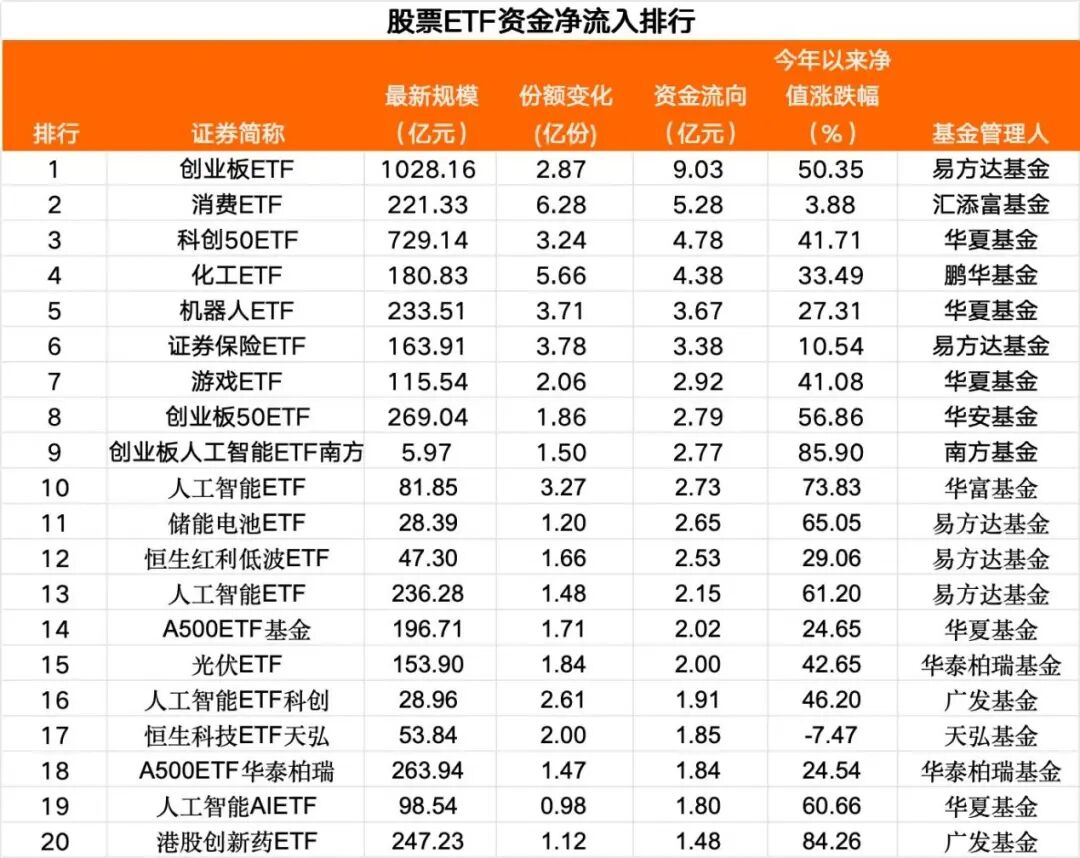 股票ETF市场资金流向数据显示,本周一股票ETF资金净流入超36亿元,创业板指、人工智能、消费等方向强力“吸金”。