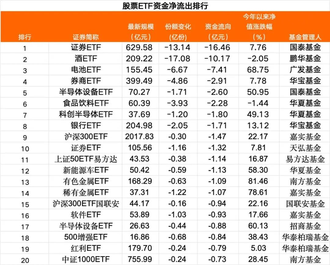 从资金净流出情况来看,本周一,股票ETF中有14只净流出资金超过1亿元,证券、酒、电池、半导体设备等行业主题ETF“失血”相对靠前。