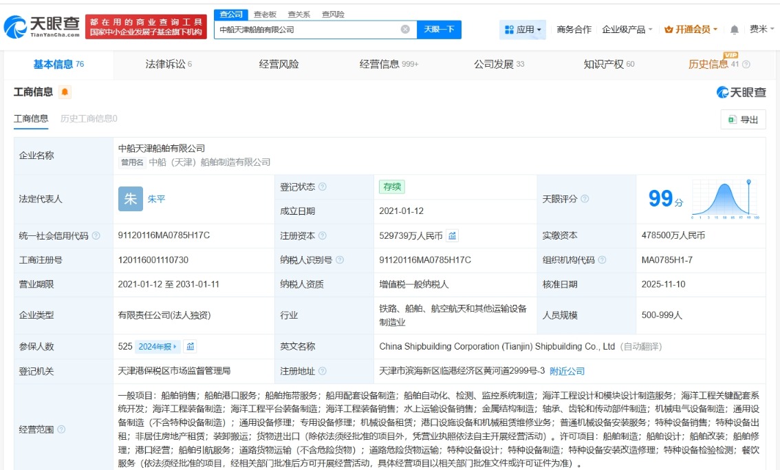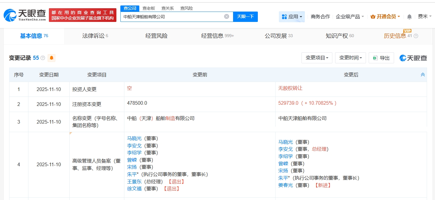 每经AI快讯,天眼查App显示,近日,中船(天津)船舶制造有限公司发生工商变更,企业名称变更为中船天津船舶有限公司,注册资本由47.85亿元人民币增至约53亿元人民币,增幅约11%。同时,部分主要人员发生变更。该公司成立于2021年1月,法定代表人为朱平,经营范围包括船舶销售、船舶港口服务、船舶拖带服务、船用配套设备制造等,由大连船舶重工集团有限公司全资持股。