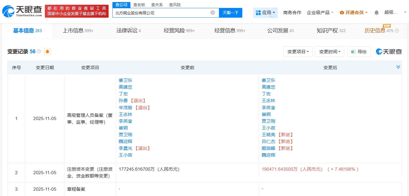 每经AI快讯,天眼查工商信息显示,近日,北方铜业(000737)发生工商变更,注册资本由约17.72亿元人民币增至约19.05亿元人民币,增幅约7.46%,同时部分高管发生变更。北方铜业股份有限公司成立于1996年4月,法定代表人为魏迎辉,经营范围含非煤矿山矿产资源开采、金属矿石销售、常用有色金属冶炼等。股东信息显示,该公司由中条山有色金属集团有限公司、山西焦煤运城盐化集团有限责任公司、晋创投资有限公司等共同持股。